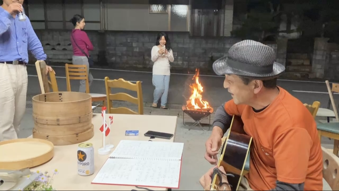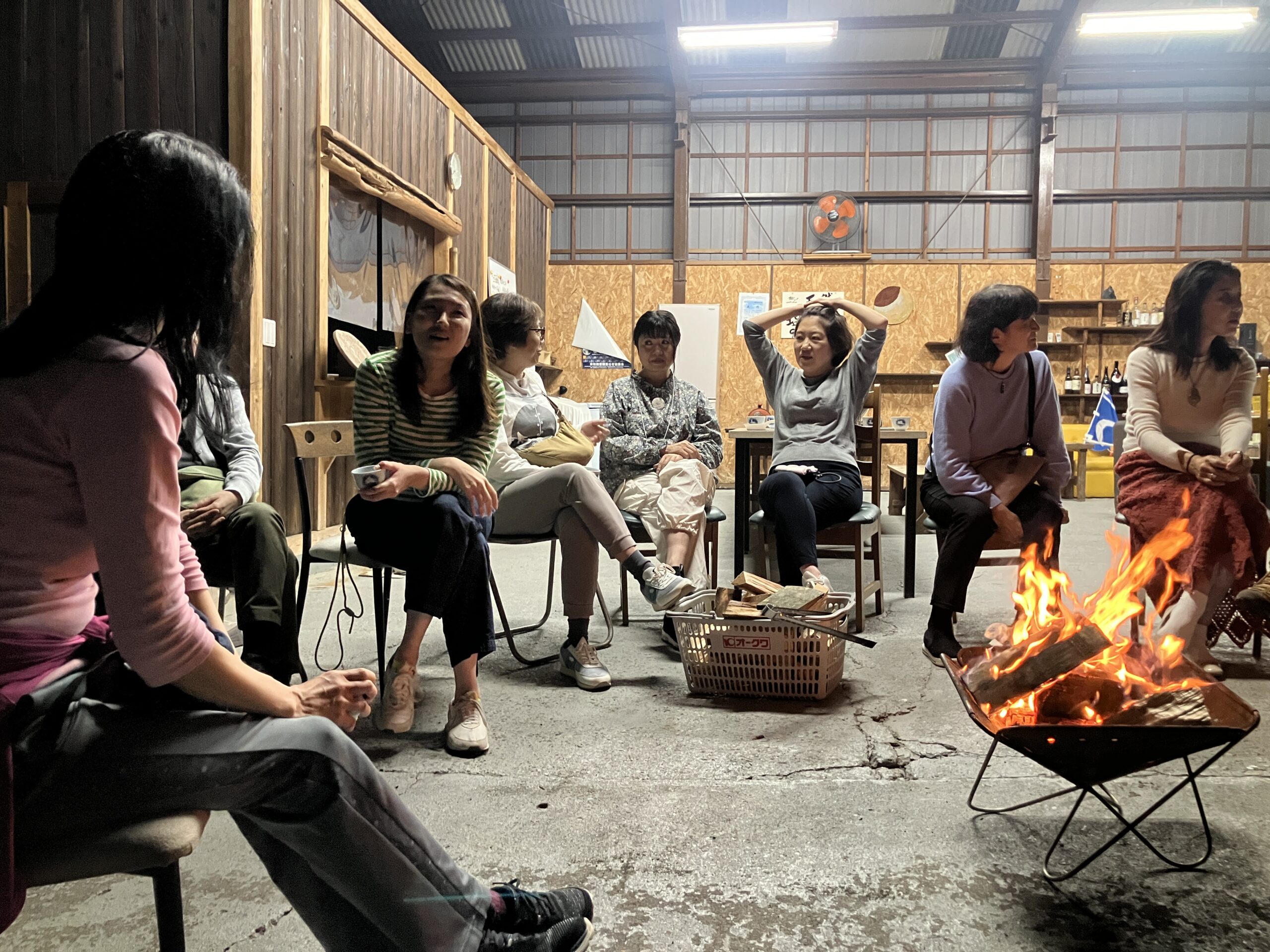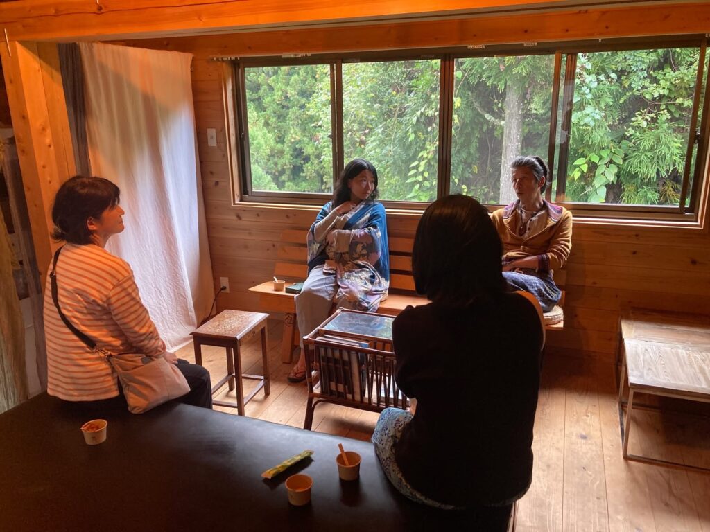 そんな問いから始まった初日。森を歩きながら語る“Hike & Tell”、野草摘みと野草茶のティータイム、そして「食の瞑想」。焚き火を囲んでの“hygge time”にはスペシャルゲスト・やまちゃんも加わり、笑顔と対話があふれる夜となりました。天の川温泉で心も体もほぐれ、天川の時間が静かに流れ出します。
