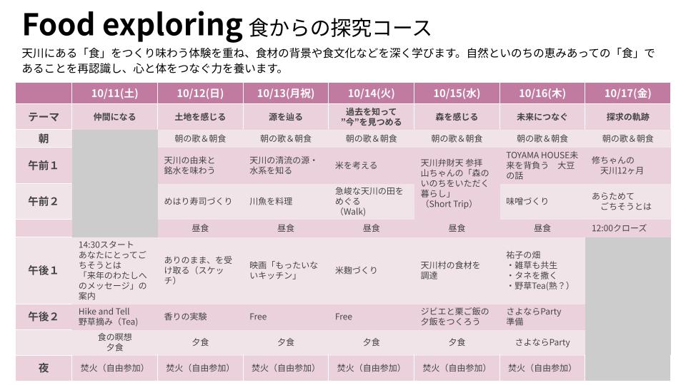 緑深く静かな山々に囲まれた天川村で、「食」を通して生き方を見つめる一週間。食べることは、自然の恵みをいただくこと。そして、食べることは、生きること。全国から集まった8名の参加者が、それぞれの想いを胸に“Food Exploring”へ。